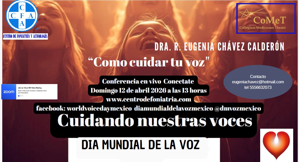 | Conferencia: “ Como cuidar tu Voz, Cuidando nuestras Voces ” Conferencia virtual Domingo 12 de abril 26 a las 13.00 horas de la Ciudad de México, México Conéctate |
